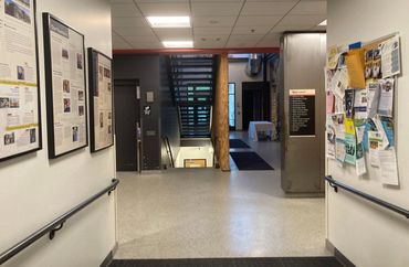 When entering the building from the main entrance, to find the elevator, turn right after the